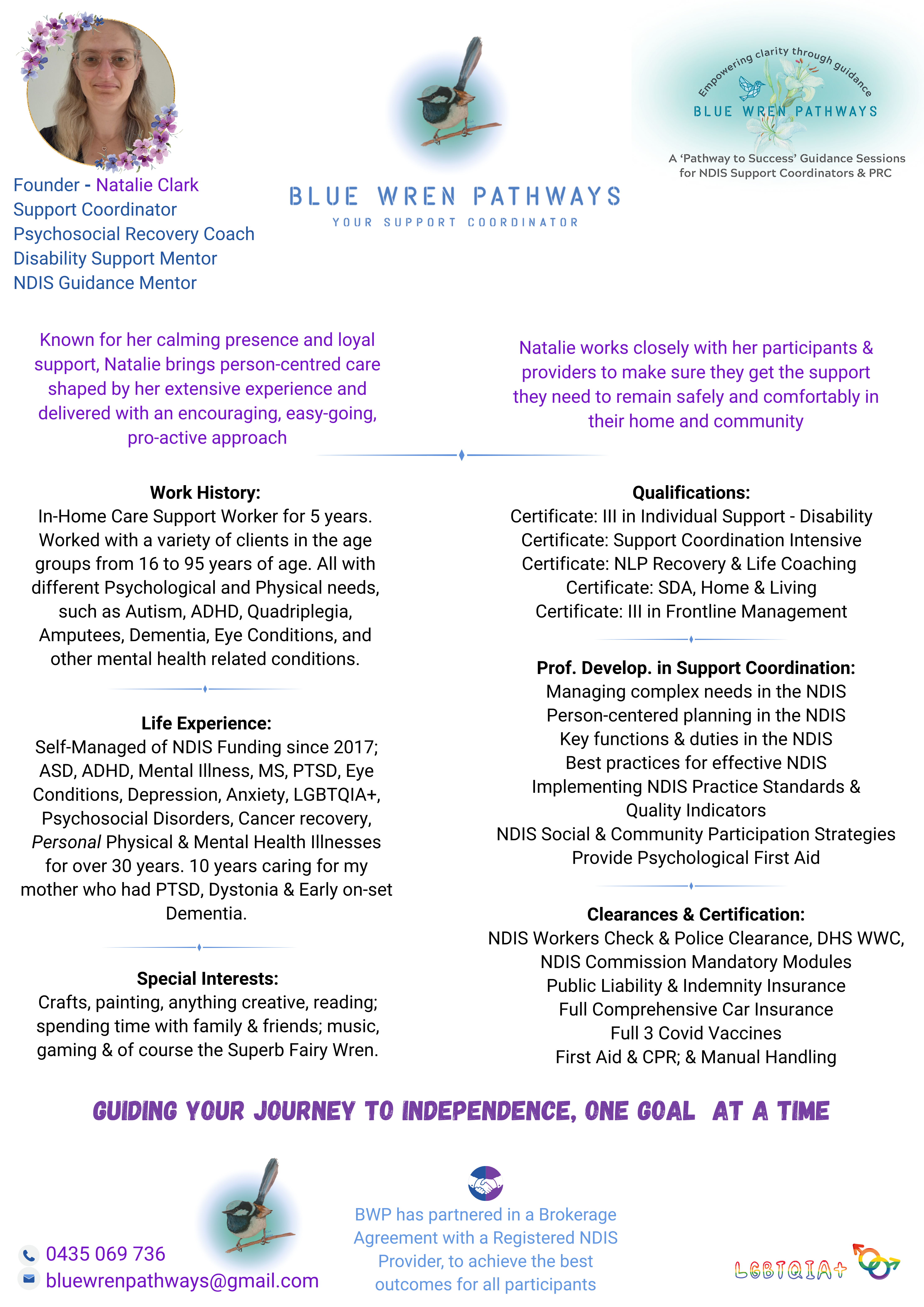 Driven by her passion for caring for her late mum and the love for the Superb Fairy Wren, she felt that naming the business ‘Blue Wren Pathways’ would be a perfect way to honor her late parents, which she founded in March 2025.